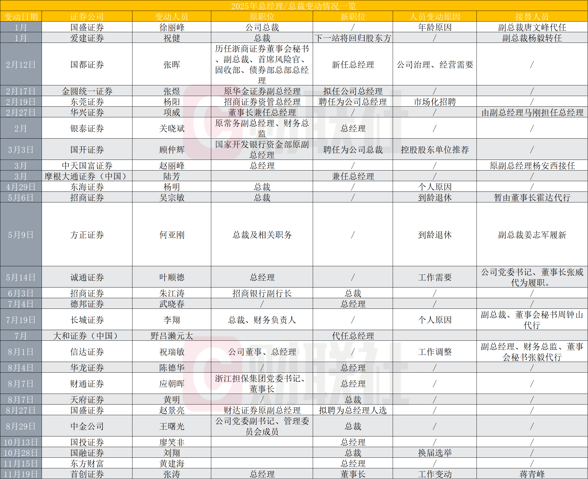 回顾2025年以来,则已有33位券商正/副董事长、28位券商总经理/总裁发生变动。
