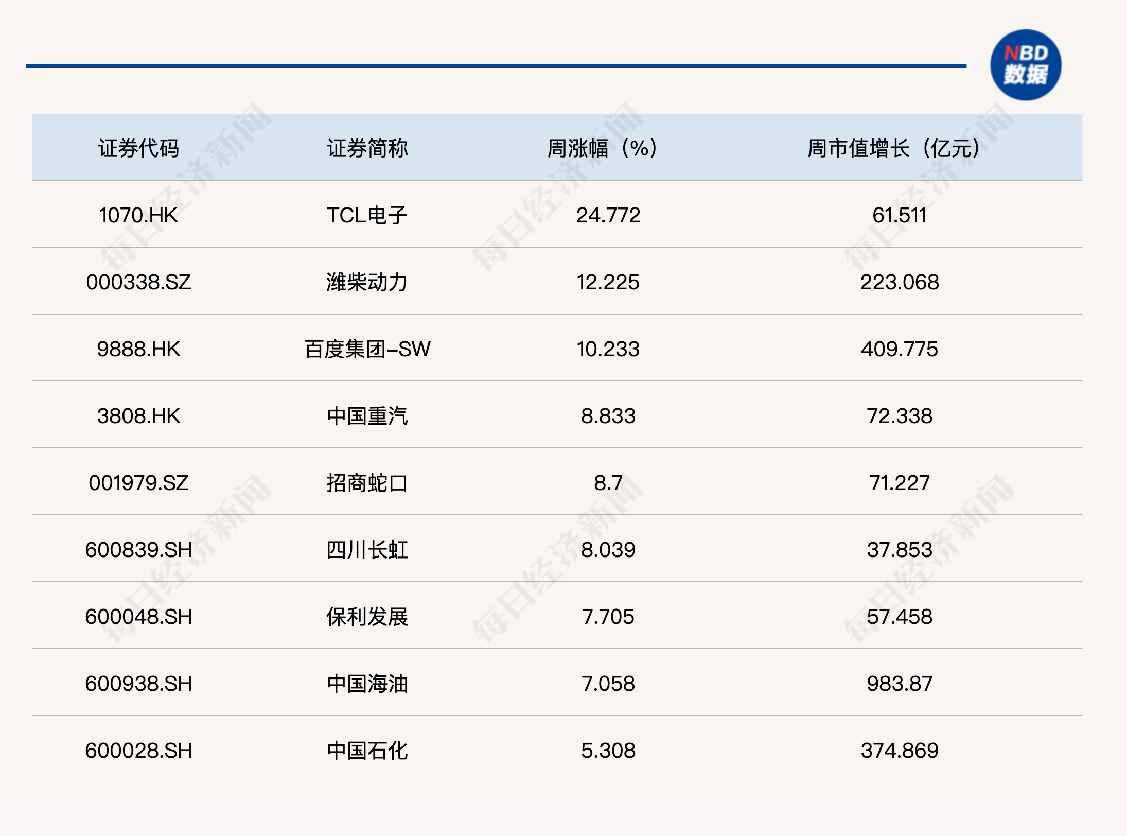 成分股方面,TCL电子本周涨幅高达24.77%;潍柴动力继续保持强势,周涨幅也达到12.33%;此外,百度集团-SW、中国重汽、招商蛇口、四川长虹、保利发展、中国海油、中国石化的周涨幅也均超过5%。周市值增长方面,中国海油本周市值增长达到983.87亿元,市值增长接近千亿元。