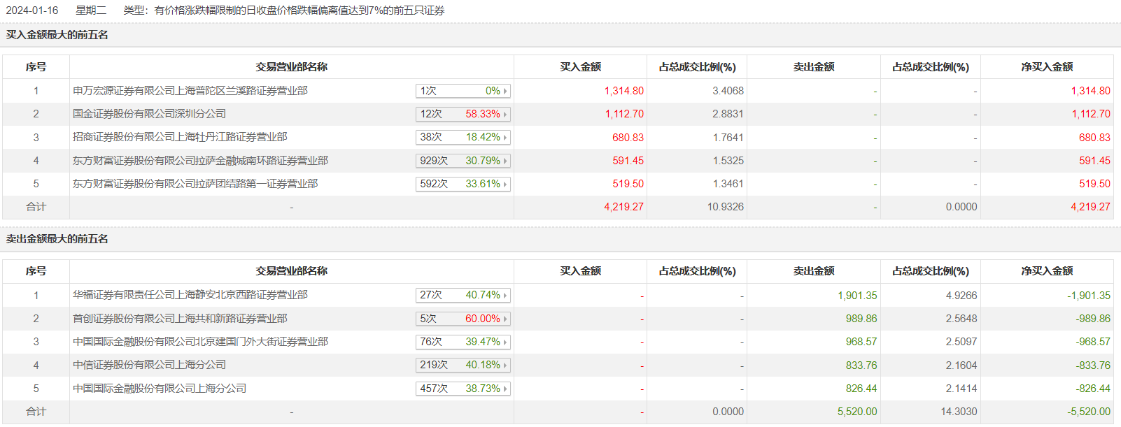 丹化科技1月16日跌停,全天换手率达11.95%,振幅达4.16%。龙虎榜数据显示,营业部席位合计净卖出1300.72万元。其中,华福证券上海静安北京西路证券营业部、首创证券上海共和新路证券营业部分别卖出1901.35万元、989.86万元;申万宏源证券有限公司上海普陀区兰溪路证券营业部、国金证券深圳分公司分别买入1314.80万元、1112.70万元。