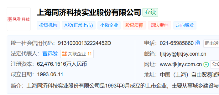 天眼查显示,同济科技成立于1993年6月,位于上海市,1994年3月在上交所主板上市,是一家城乡建设与发展领域价值提升综合服务企业,主营业务包括决策咨询、项目管理、建设施工、运营维护、投融资和数值赋能。