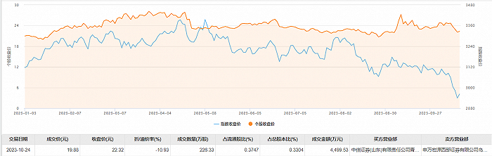 10月24日大宗交易成交226.33万股,成交额4499.53万元,占当日总成交额的22.51%,成交价19.88元,较市场收盘价折价10.93%。