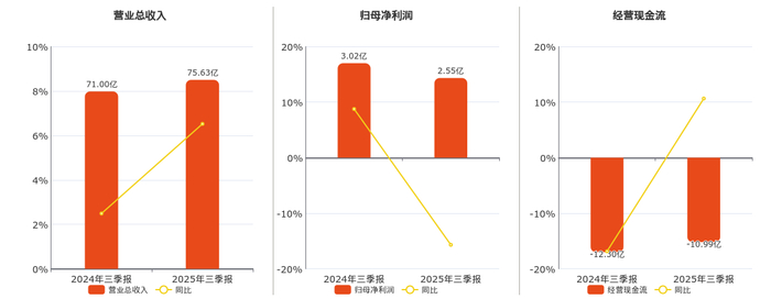 公司营业总收入为75.63亿元,在已披露的同业公司中排名第3,较去年同报告期营业总收入增加4.63亿元,实现5年连续上涨,同比较去年同期上涨6.52%。归母净利润为2.55亿元,在已披露的同业公司中排名第7,较去年同报告期归母净利润减少4736.94万元,同比较去年同期下降15.68%。经营活动现金净流入为-10.99亿元,在已披露的同业公司中排名第103,较去年同报告期经营活动现金净流入增加1.31亿元。