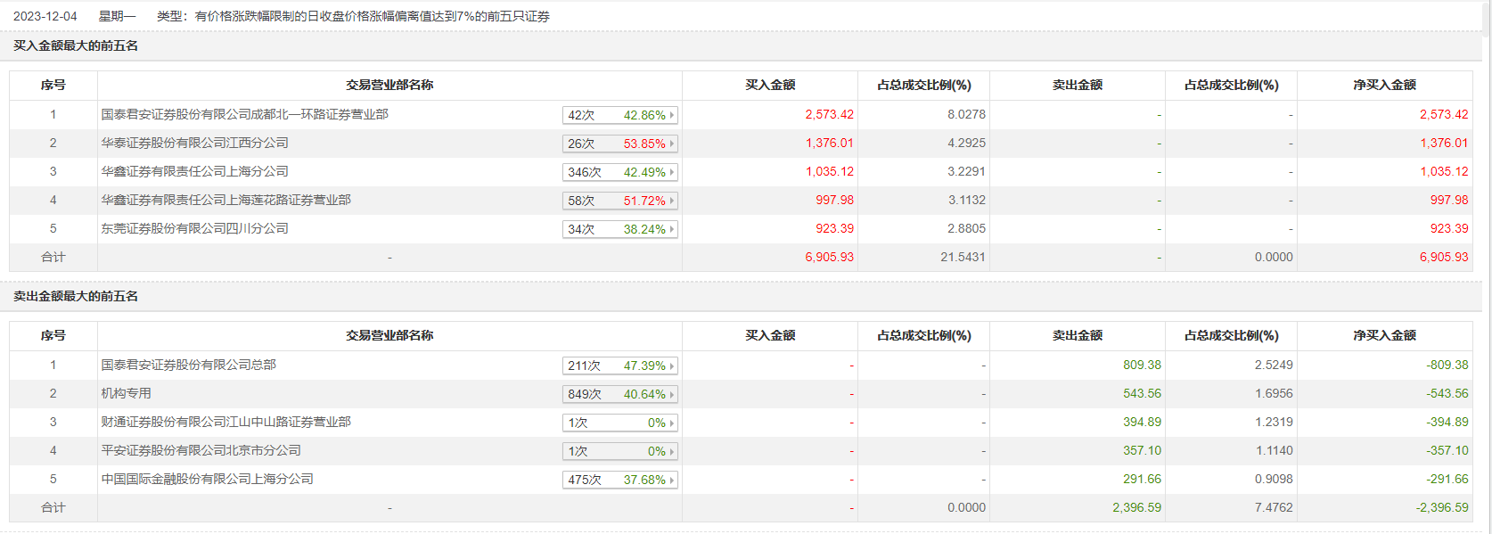 12月4日,龙建股份今日涨停,全天换手率达7.2%,振幅达9.86%。龙虎榜数据显示,营业部席位合计净买入4509.34万元。其中,机构合计净卖出543.56万元。此外,国泰君安证券成都北一环路证券营业部、华泰证券江西分公司分别买入2573.42万元、1376.01万元;国泰君安证券总部、财通证券江山中山路证券营业部分别卖出809.38万元、394.89万元。