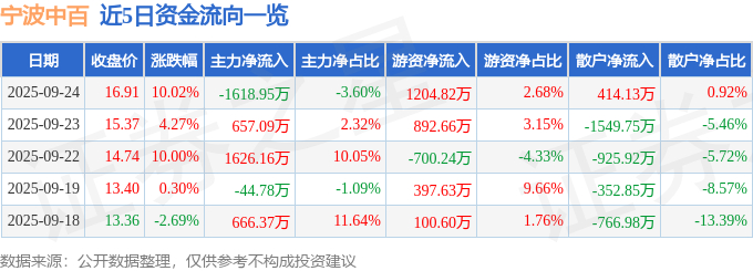 证券之星消息,宁波中百9月24日涨停收盘,收盘价16.91元。该股于13点18分涨停,16次打开涨停,截止收盘封单资金为100.26万元,占其流通市值0.03%。