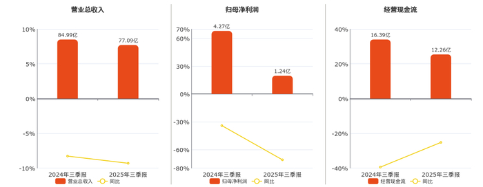 公司营业总收入为77.09亿元,在已披露的同业公司中排名第9,较去年同报告期营业总收入减少7.91亿元,同比较去年同期下降9.30%。归母净利润为1.24亿元,在已披露的同业公司中排名第16,较去年同报告期归母净利润减少3.03亿元,同比较去年同期下降71.02%。经营活动现金净流入为12.26亿元,在已披露的同业公司中排名第5,较去年同报告期经营活动现金净流入减少4.13亿元,同比较去年同期下降25.19%。