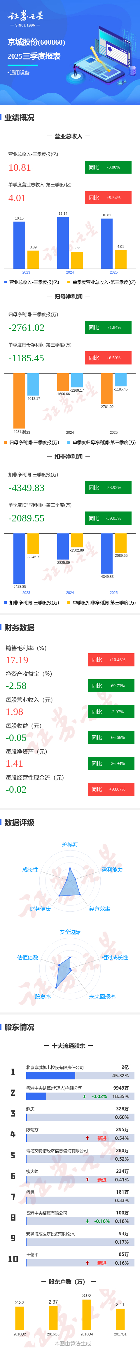 证券之星消息,京城股份2025年三季报显示,前三季度公司主营收入10.81亿元,同比下降3.0%;归母净利润-2761.02万元,同比下降71.85%;扣非净利润-4349.83万元,同比下降53.93%;其中2025年第三季度,公司单季度主营收入4.01亿元,同比上升9.55%;单季度归母净利润-1185.45万元,同比上升6.6%;单季度扣非净利润-2089.55万元,同比下降39.04%;负债率58.23%,投资收益365.74万元,财务费用903.42万元,毛利率17.19%。