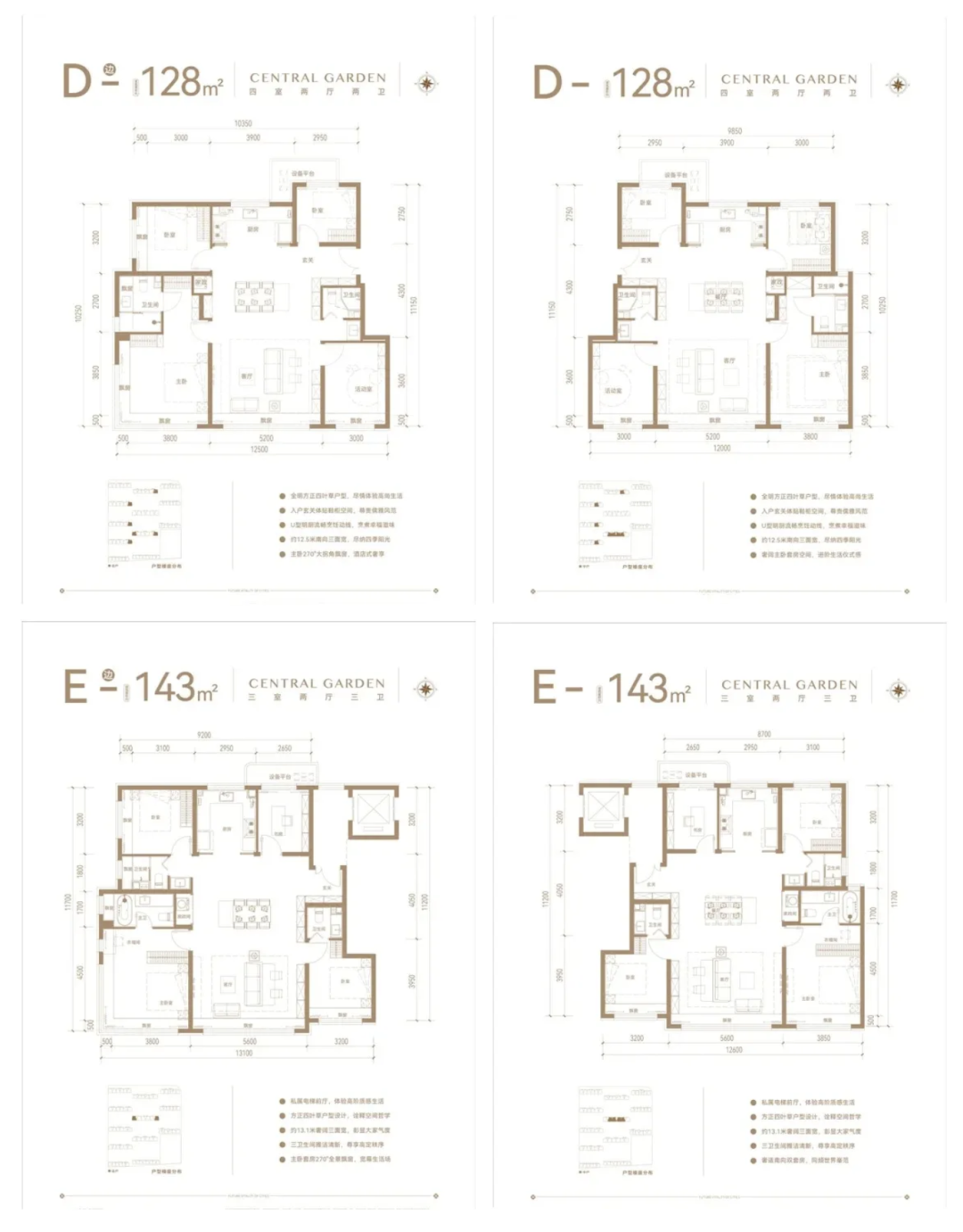 项目共12栋8-15F小高层,主力面积段为84-143㎡三居、四居户型,大面宽大飘窗设计,得房率在82%左右,部分118㎡三室两厅户型得房率接近84%。