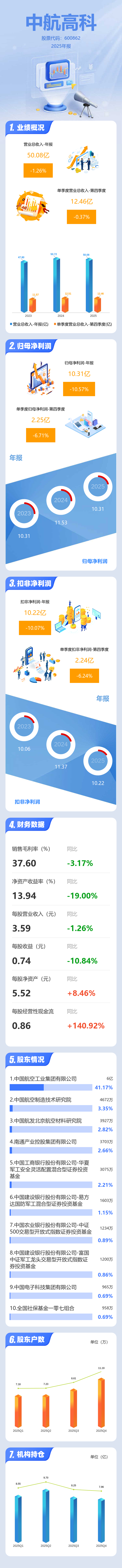 证券之星消息,中航高科2025年年报显示,当年度公司主营收入50.08亿元,同比下降1.27%;归母净利润10.31亿元,同比下降10.57%;扣非净利润10.22亿元,同比下降10.07%;其中2025年第四季度,公司单季度主营收入12.46亿元,同比下降0.38%;单季度归母净利润2.25亿元,同比下降6.72%;单季度扣非净利润2.24亿元,同比下降6.25%;负债率19.81%,投资收益-1501.36万元,财务费用-1451.71万元,毛利率37.6%。