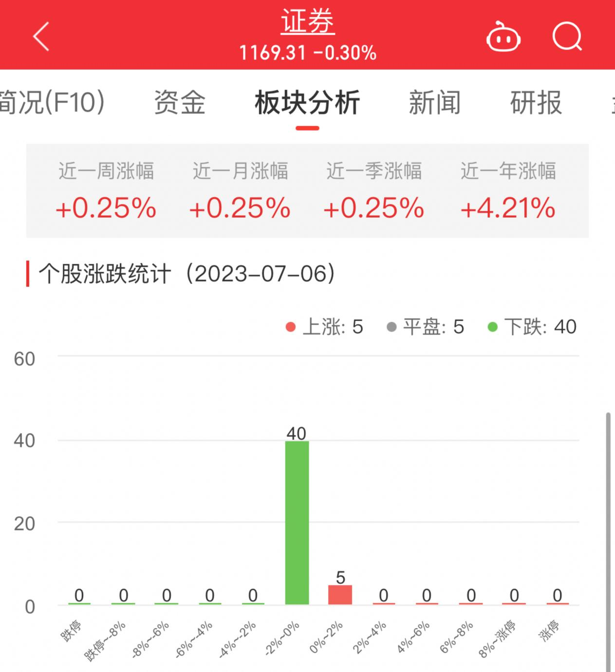 中国经济网北京7月6日讯 今日,证券板块整体跌幅0.30%,其中5只股票上涨,5只股票平盘,40只股票下跌。