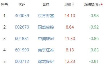 东方财富、国盛金控、中国银河、南京证券、锦龙股份位列涨幅榜后五位,涨幅分别为-0.98%、-0.92%、-0.86%、-0.85%、-0.81%。