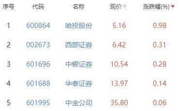 其中,哈投股份、西部证券、中银证券、华泰证券、中金公司位列板块涨幅前五位,涨幅分别为0.98%、0.31%、0.28%、0.14%、0.06%。