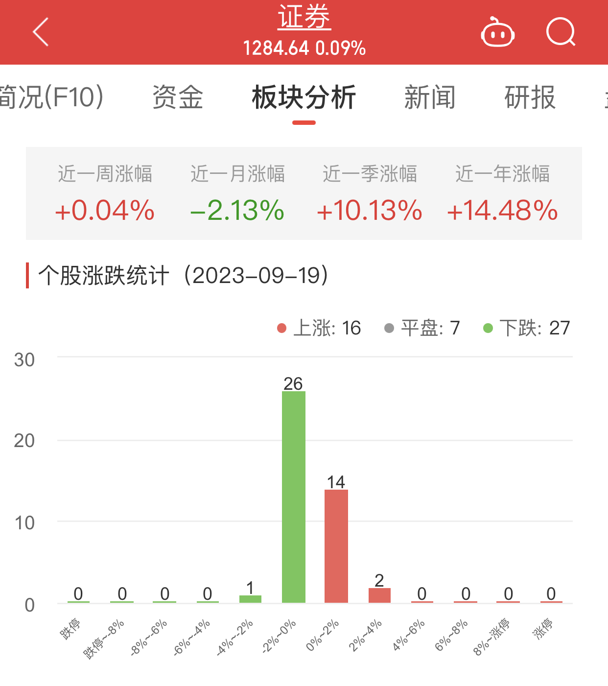 中国经济网北京9月19日讯 今日,证券板块整体涨幅0.09%,其中16只股票上涨,7只股票平盘,27只股票下跌。