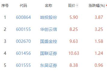 其中,哈投股份、华创云信、国盛金控、国联证券、东吴证券位列板块涨幅前五位,涨幅分别为3.87%、3.25%、1.58%、1.24%、0.96%。
