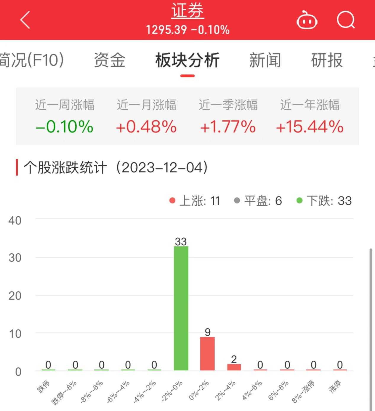 中国经济网北京12月4日讯 今日,证券板块整体跌幅0.10%,其中11只股票上涨,6只股票平盘,33只股票下跌。