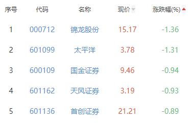 锦龙股份、太平洋、国金证券、天风证券、首创证券位列涨幅榜后五位,涨幅分别为-1.36%、-1.31%、-0.94%、-0.93%、-0.89%。