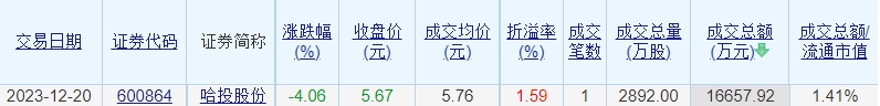 哈投股份昨日大宗交易成交1.67亿元 溢价率1.59%