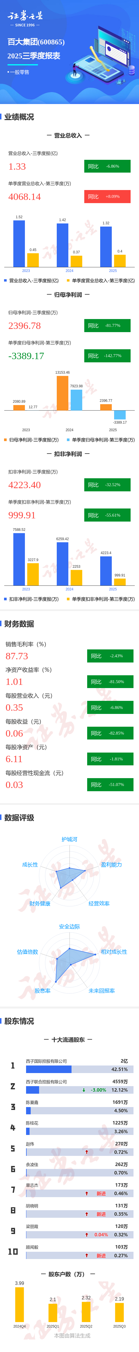 图解百大集团三季报:第三季度单季净利润同比下降142.77%