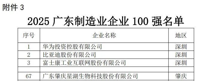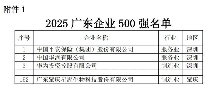 10月29日,广东省企业联合会、广东省企业家协会共同发布了2025广东企业500强和广东民营企业、制造业企业、服务业企业、创新企业100强等榜单。星湖科技凭借效益提升和发展规模优势,荣登2025广东企业500强第152位、广东制造业企业100强第67位、广东创新企业100强第63位,整体实力持续增强。