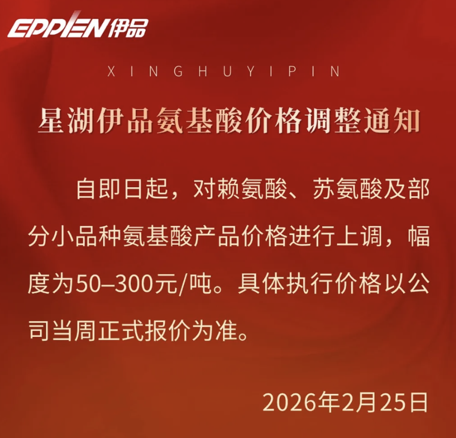 人民财讯2月25日电,2月25日,星湖科技旗下星湖伊品发布《氨基酸产品价格调整通知》:自即日起,对赖氨酸、苏氨酸及部分小品种氨基酸产品价格进行上调,幅度为50—300元/吨。具体执行价格以公司当周正式报价为准。