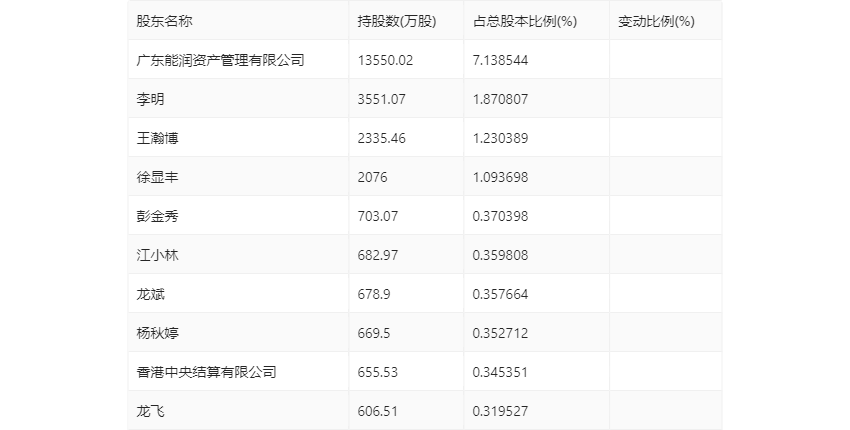 一季报显示,2024年一季度末公司十大流通股东中,持股最多的为广东能润资产管理有限公司,占比7.14%。十大流通股东名单相比2023年年报维持不变。在具体持股比例上,王瀚博、江小林持股有所上升,香港中央结算有限公司持股有所下降。