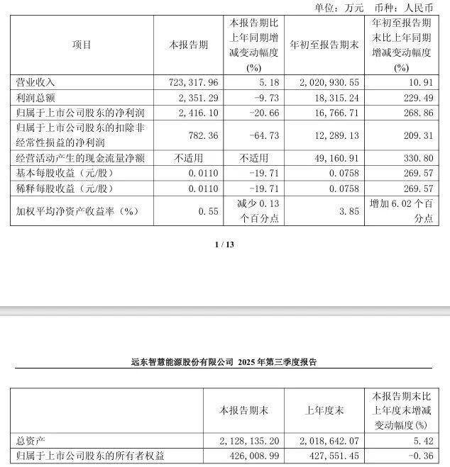 近日,远东智慧能源股份有限公司发布2025年第三季度报告。前三季度,公司实现营业收入202.09亿元,同比增长10.91%;归母净利润1.68亿元,同比增长268.86%。第三季度单季度实现营业收入72.33亿元,同比增长5.18%;归母净利润2416万元,同比减少20.66%。
