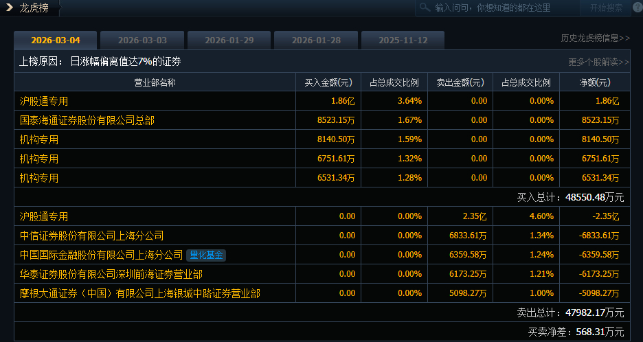 石化油服(600871)今日涨停,成交额51.16亿元,换手率9.23%,盘后龙虎榜数据显示,沪股通专用席位买入1.86亿元并卖出2.35亿元,3家机构专用席位净买入2.14亿元。