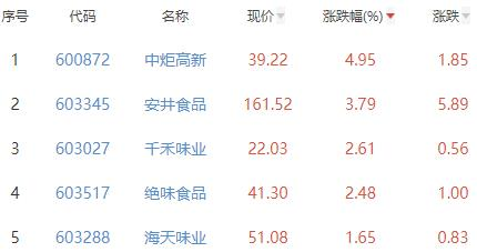 其中,中炬高新、安井食品、千禾味业、绝味食品、海天味业位列板块涨幅前五位,涨幅分别为4.95%、3.79%、2.61%、2.48%、1.65%。
