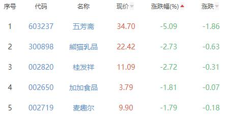 五芳斋、熊猫乳品、桂发祥、加加食品、麦趣尔位列涨幅榜后五位,涨幅分别为-5.09%、-2.73%、-2.72%、-1.81%、-1.79%。