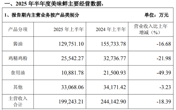 证券之星了解到,作为公司的绝对核心,公司调味品板块在上半年承压显著,呈现“多品类遇冷”的格局。具体来看,酱油作为调味品板块营收贡献占比超六成的主力品类,上半年实现销售收入12.98亿元,同比下滑16.68%,核心支柱作用呈现弱化;厨邦品牌旗下第二大品类鸡精鸡粉同期收入2.55亿元,同比大幅下降21.98%;食用油产品降幅更是接近腰斩,同比骤降49.39%至1.09亿元;而包含蚝油、食醋、料酒等在内的其他调味品品类,也未能起到“补位”作用,上半年收入3.3亿元,同比仍小幅下降3.23%。