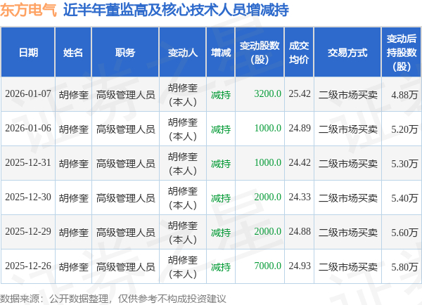 证券之星消息,根据1月8日市场公开信息、上市公司公告及交易所披露数据整理,东方电气(600875)最新董监高及相关人员股份变动情况:2026年1月6日至2026年1月7日公司高级管理人员胡修奎共减持公司股份4200.0股,占公司总股本为0.0002%。变动期间公司股价上涨4.32%,1月7日当日收盘报25.6元。