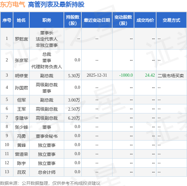 东方电气近半年内的董监高及核心技术人员增减持详情如下: