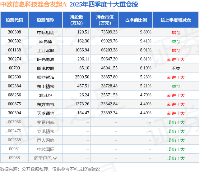 根据2025基金年报公募基金重仓股数据,重仓该股的公募基金共24家,其中持有数量最多的公募基金为中欧基金的中欧信息科技混合发起A。中欧信息科技混合发起A目前规模为35.85亿元,最新净值2.0941(2月13日),较上一交易日下跌1.69%。该公募基金现任基金经理为杜厚良。杜厚良在任的基金产品包括:中欧港股通科技混合发起A,管理时间为2025年9月16日至今,期间收益率为0.93%。