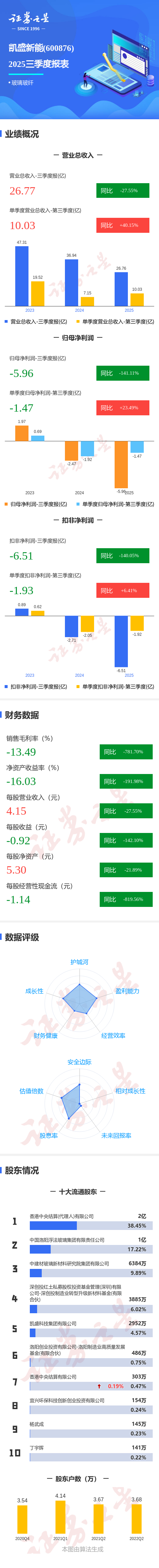 证券之星消息,凯盛新能2025年三季报显示,前三季度公司主营收入26.77亿元,同比下降27.55%;归母净利润-5.96亿元,同比下降141.12%;扣非净利润-6.51亿元,同比下降140.05%;其中2025年第三季度,公司单季度主营收入10.03亿元,同比上升40.15%;单季度归母净利润-1.47亿元,同比上升23.5%;单季度扣非净利润-1.93亿元,同比上升6.41%;负债率71.38%,投资收益-783.07万元,财务费用8478.03万元,毛利率-13.49%。