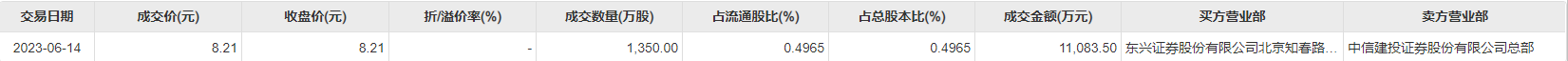 6月14日大宗交易成交1350万股,成交额1.11亿元,占当日总成交额的28.69%,成交价8.21元,较市场收盘价8.21元持平。