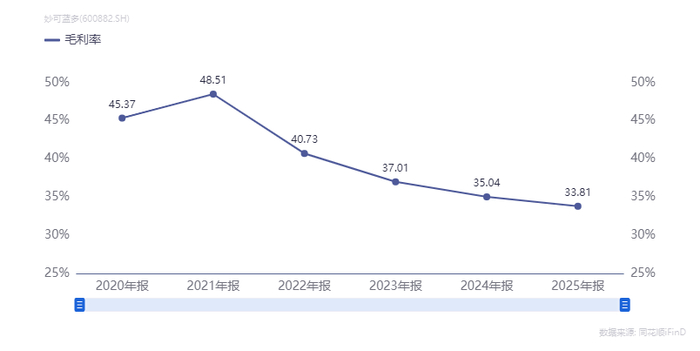 妙可蓝多奶酪业务毛利率表现,图源:同花顺iFind受此影响,妙可蓝多奶酪业务毛利率已经连续五年下滑,2025年仅33.81%,较2021年整体下滑了14.7个百分点。但其余副业(贸易产品、液态奶及其他)平均21.18%的毛利水平,一定程度也缓解了公司产品结构调整过程的阵痛。