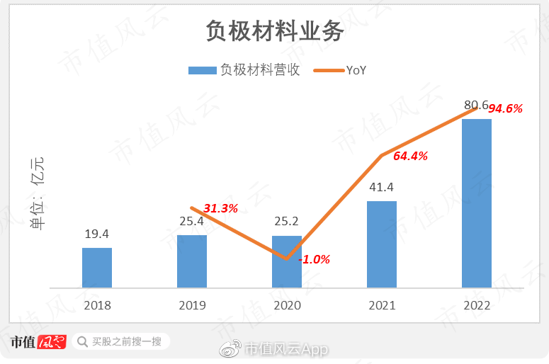2022年,公司负极材料业务营收81亿元,同比增94.6%。