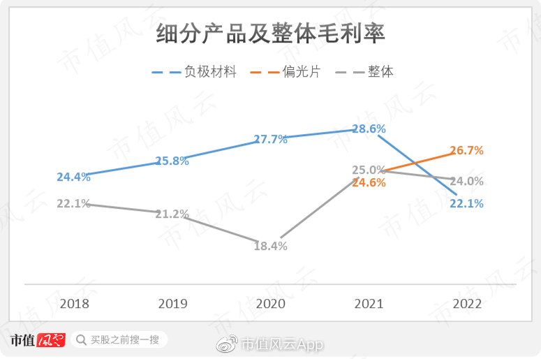 2022年,公司偏光片业务毛利率26.7%,同比提升2.1个百分点,并且高于负极材料业务毛利率22.1%,是拉动整体毛利率的主力。
