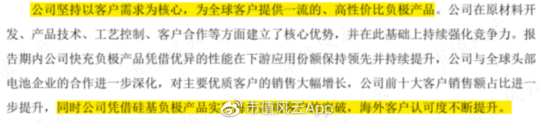 目前,公司的硅基负极已实现产业化应用,并且借此实现了海外高端客户的突破。