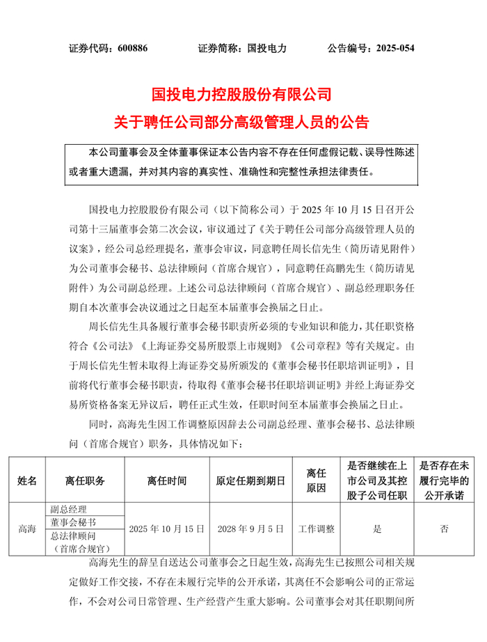 国投电力发布公告称,公司于10月15日召开公司第十三届董事会第二次会议,审议通过了《关于聘任公司部分高级管理人员的议案》,经公司总经理提名,董事会审议,同意聘任周长信先生为公司董事会秘书、总法律顾问(首席合规官),同意聘任高鹏先生为公司副总经理。上述公司总法律顾问(首席合规官)、副总经理职务任期自本次董事会决议通过之日起至本届董事会换届之日止。