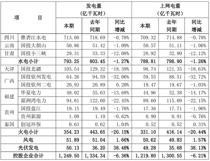 国投电力:第三季度发电量478.91亿千瓦时 同比降14.42%