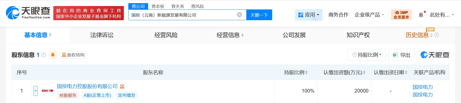 每经AI快讯,天眼查工商信息显示,近日,国投(云南)新能源发展有限公司成立,法定代表人为高鹏,注册资本2亿元人民币,经营范围含发电业务、输电业务、供(配)电业务,水力发电,生物质燃气生产和供应,发电技术服务,风力发电技术服务,太阳能发电技术服务,储能技术服务等。股东信息显示,该公司由国投电力(600886)全资持股。