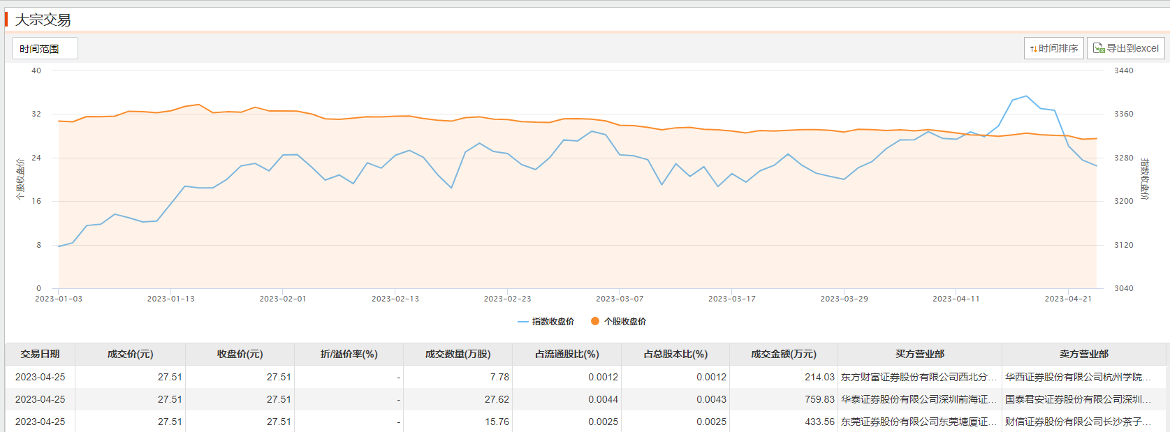 4月25日大宗交易成交51.16万股,成交额1407.42万元,占当日总成交额的1.15%,成交价27.51元,较市场收盘价27.51元持平。