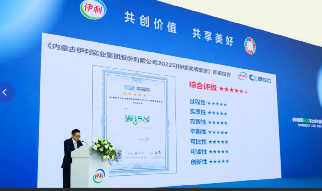 中国社科院教授、责任云研究院创始院长钟宏武,宣布经过对过程性、实质性、完整性、平衡性、可比性、可读性、创新性七个方面的综合评价,“《内蒙古伊利实业集团股份有限公司2022可持续发展报告》为‘五星佳’级,是一份典范的企业社会责任报告。”