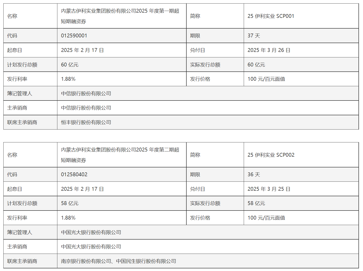 公告显示,伊利股份发行了2025年度第一、二期超短期融资券,现将发行结果公告如下: