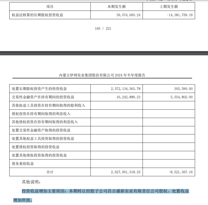 这里需要指出的是,2024年前三季度的归母净利润之所以能创下新高,并且增速得以大幅回升,主要还是在2024年年初时转让了控股子公司昌吉盛新实业有限责任公司股权,当时的交易对价是26.47亿元。这部分的收益被伊利股份计入投资收益,相比此前年份,伊利股份的投资收益立马同比暴涨了7191%。