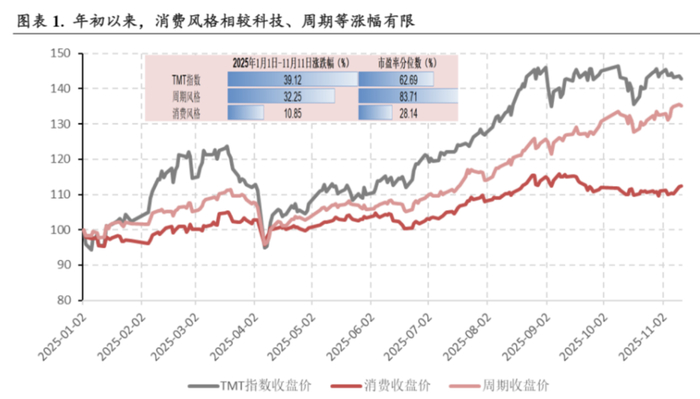 中银证券认为,CPI同比回暖、盈利-估值性价比占优催化,消费风格或将迎来轮动补涨。2025年以来,科技领涨趋势明显,年初以来涨幅高达39.12%,但相比之下消费风格则表现相对弱势,年初以来涨幅仅为10.85%,估值也处于较低水平。Q3以来,前期领涨的科技板块进入震荡平台期,随着三季报披露结束,市场进入业绩空窗期,市场风格轮动加速。