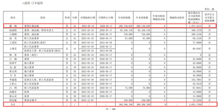 潘刚获得分红超8亿元。出生于1970年的潘刚,2005年6月至今担任伊利集团董事长、总裁职务,2023年、2024年税前薪酬分别高达2,179.3241万元、1,974.2212万元,占董监高总薪酬的比例分别为47.73%、54.06%,远超其余董监高的薪酬。