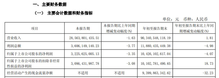 同时期归母净利润分别为94.31亿元、104.29亿元、84.53亿元,前两年分别增长8.34%、10.5%,2024年同比大幅下滑18.94%,即当年录得营收、净利双降的成绩。
