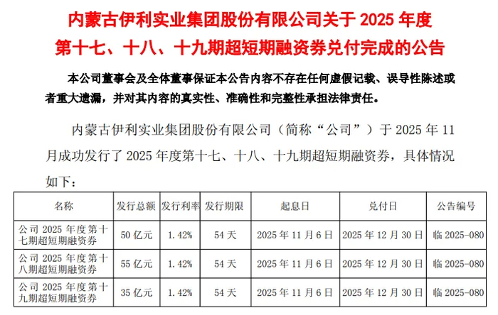 需要指出的是,伊利股份在去年7月完成第十一期科技创新债券(乡村振兴)的发行,发行总额40亿元,期限182天,发行利率1.48%,将于1月13日到期。