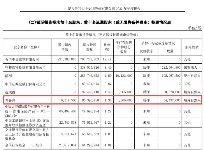 原副总裁退休后减持。2023年4月,伊利股份原副总裁刘春海因到龄原因退休,随后在当年通过二级市场减持公司股份631.75万股,持股、比例分别降低至8532.08万股、1.34%,但仍然位列前十股东,2024年末则消失在前十股东之列,期末第十大股东持股数量为8032.87万股,这意味着刘春海在当年继续实施减持,不过因为其并非大股东、高管,所以减持不用进行披露。